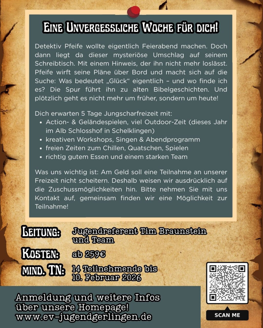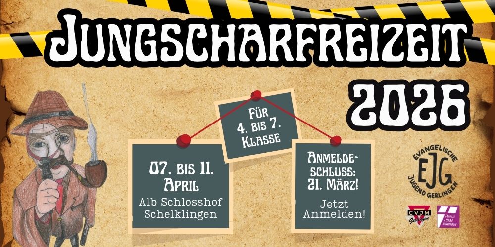 Jungscharfreizeit 2026 – Detektiv Pfeife folgt der Glücksspur – Jetzt anmelden!