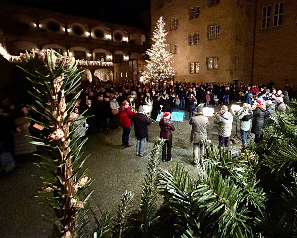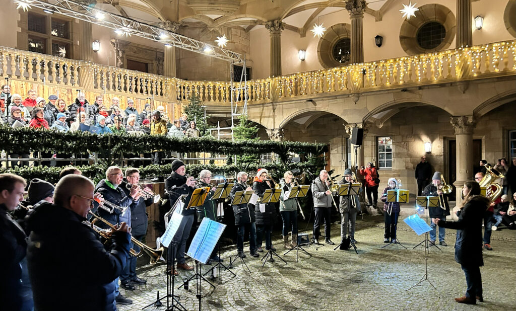 In der historischen Kulisse im Innenhof des Alten Schlosses lauschten in diesem Jahr wieder viele Besucher den meist bekannten Klängen von „Tochter Zion“ und „O du fröhliche“. Nach knapp einer Stunde musikalischer Darbietungen durften sich Bläserinnen und Bläser wie auch Sängerinnen und Sänger erst am Applaus der Zuhörer und anschließend an Glühwein und Punsch erwärmen.