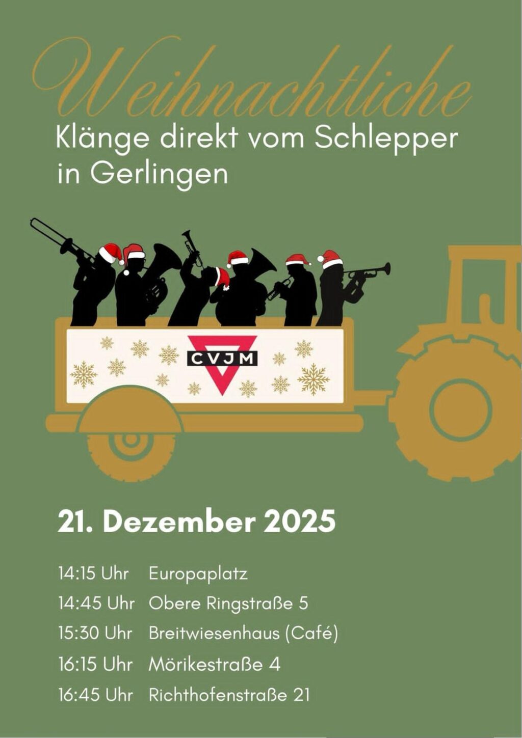 Weihnachtliche Klänge direkt vom Schlepper 17. November 2025 Am 21. Dezember spielt der CVJM Posaunenchor vom Schlepper weihnachtliche Musik an verschiedenen Stationen in Gerlingen. Älter Orangenaktion 2025 – Gemeinsam Gutes tun! Neuer Festliche Posaunenklänge beim Stuttgarter Weihnachtsmarkt